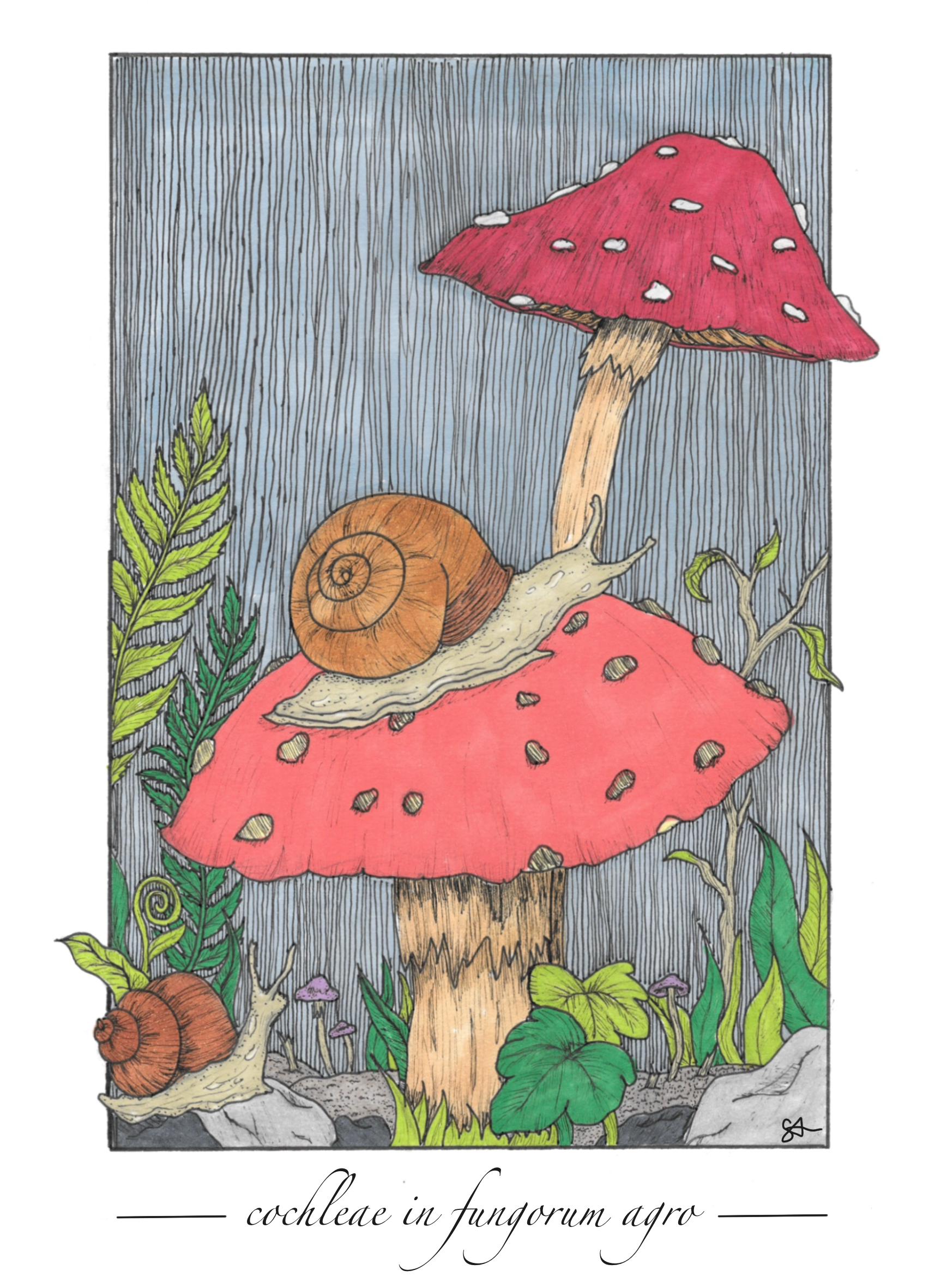 Beautiful wall decor print of original artwork. ‘Cochleae in Fungorum Agro’ is a piece of art created using ink and alcohol markers, digitally edited to bring life and colour to your home decor!*Frame not included*