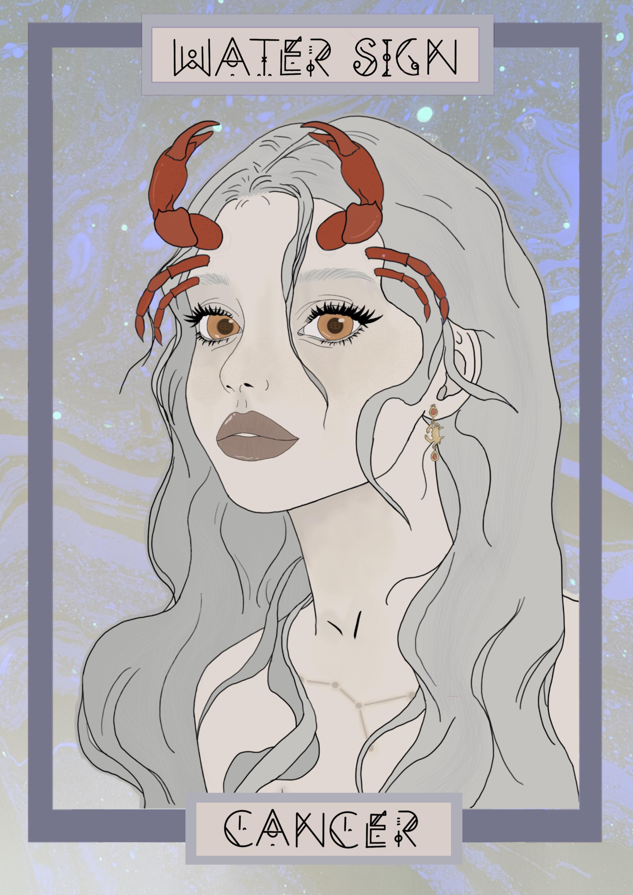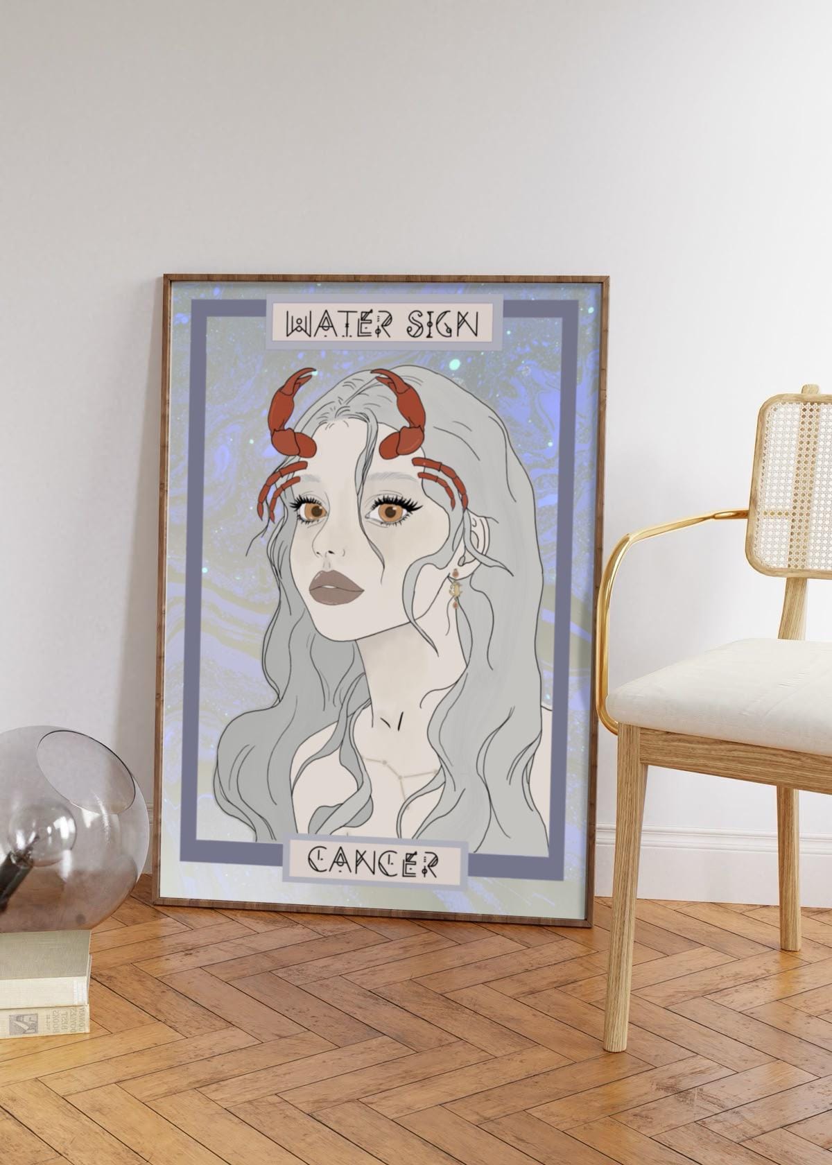 Beautiful wall decor print of original artwork. Pictured is a character design of the Cancer Star sign inspired by several attributes of the Cancer zodiac profile.