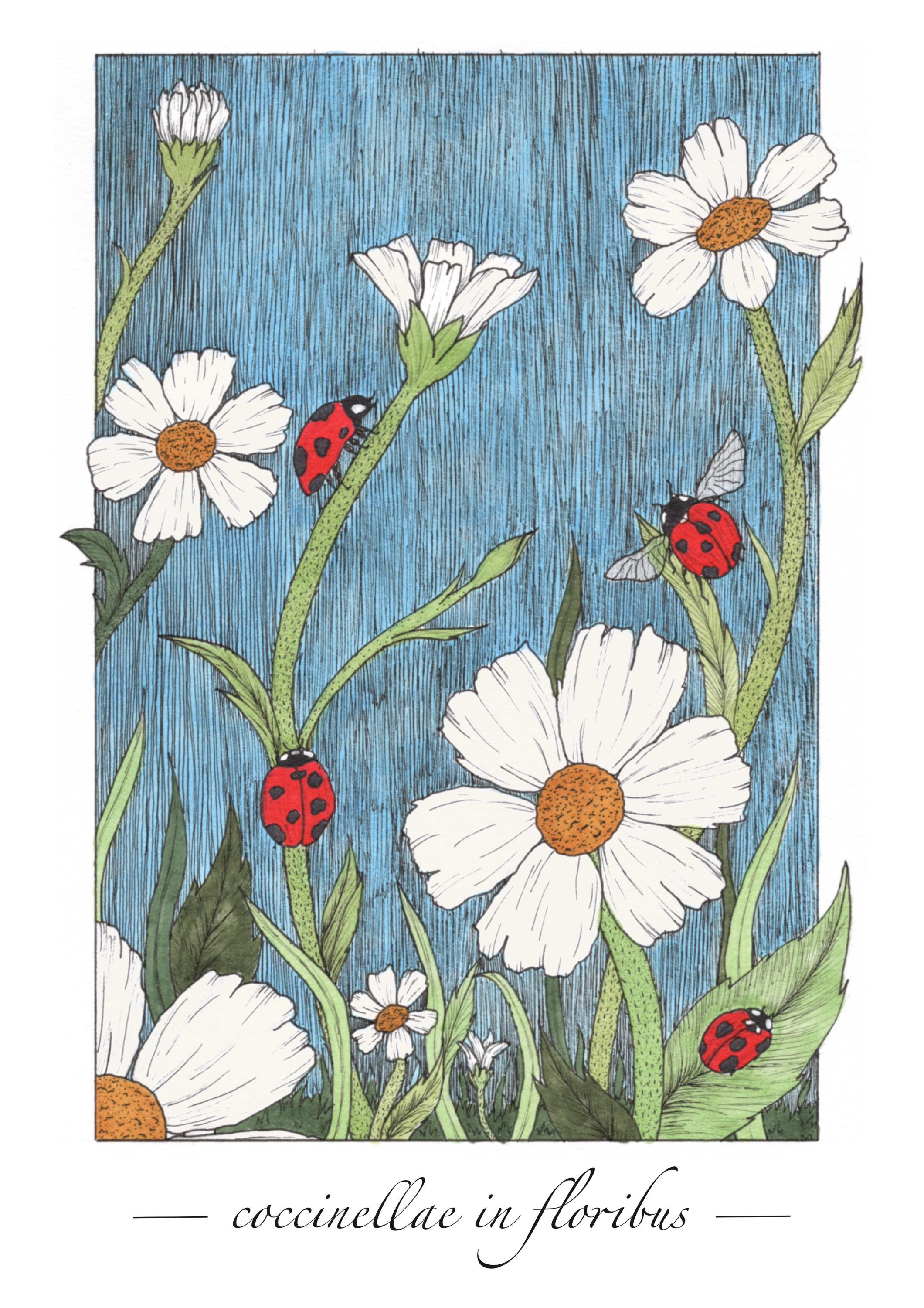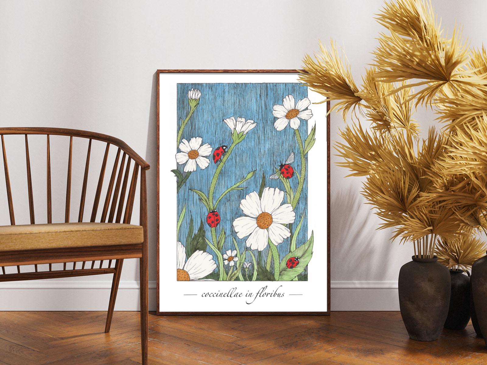 Beautiful wall decor print of original artwork. ‘Coccinellae in Floribus’ is a piece of art created using ink and alcohol markers, digitally edited to bring life and colour to your home decor!*Frame not included*