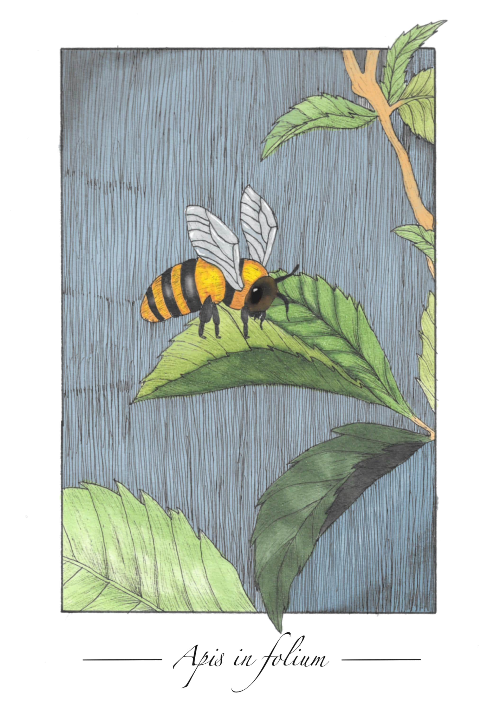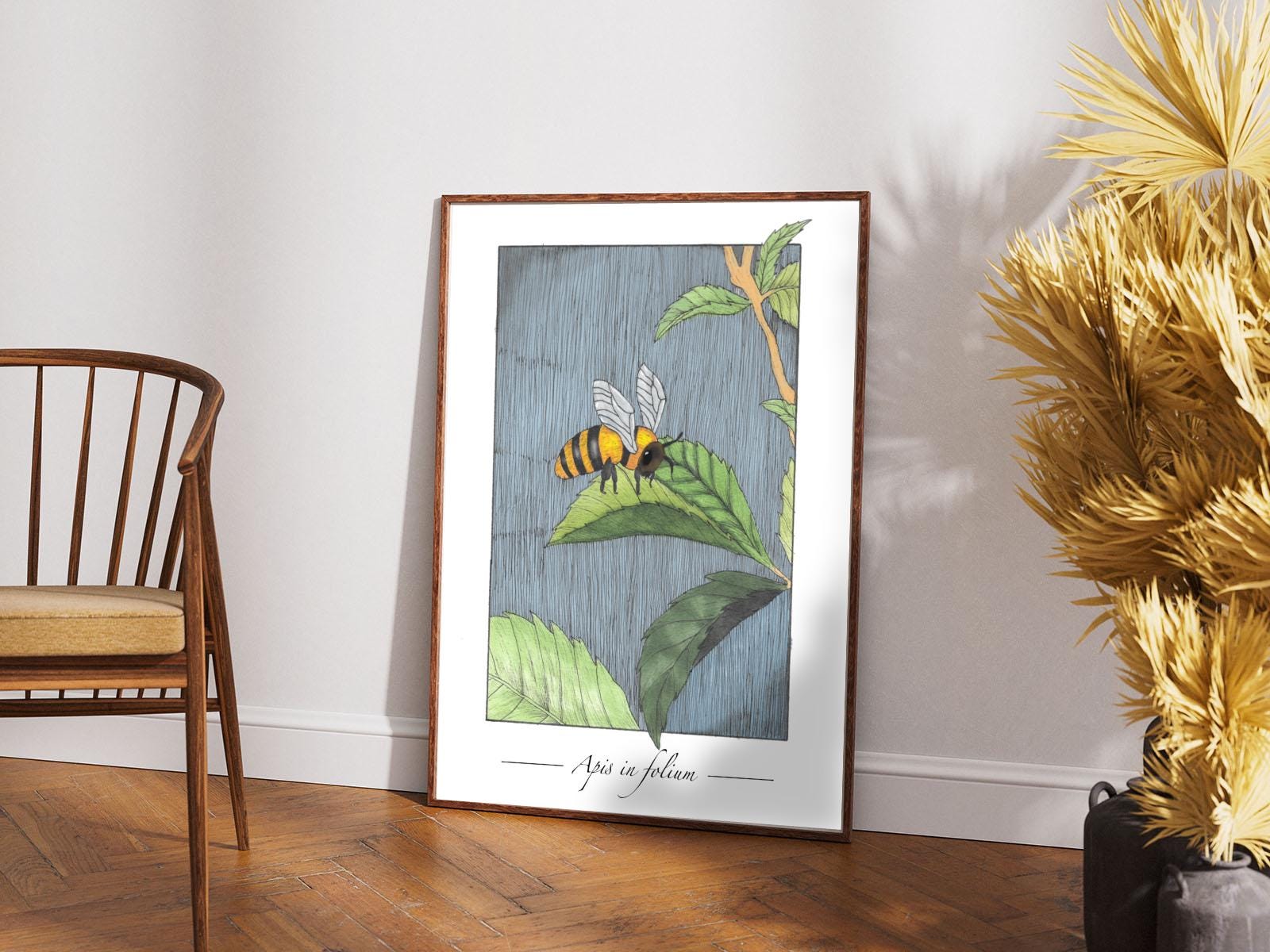Beautiful wall decor print of original artwork. ‘Apis in Folium’ is a piece of art created using ink and alcohol markers, digitally edited to bring life and colour to your home decor!*Frame not included*