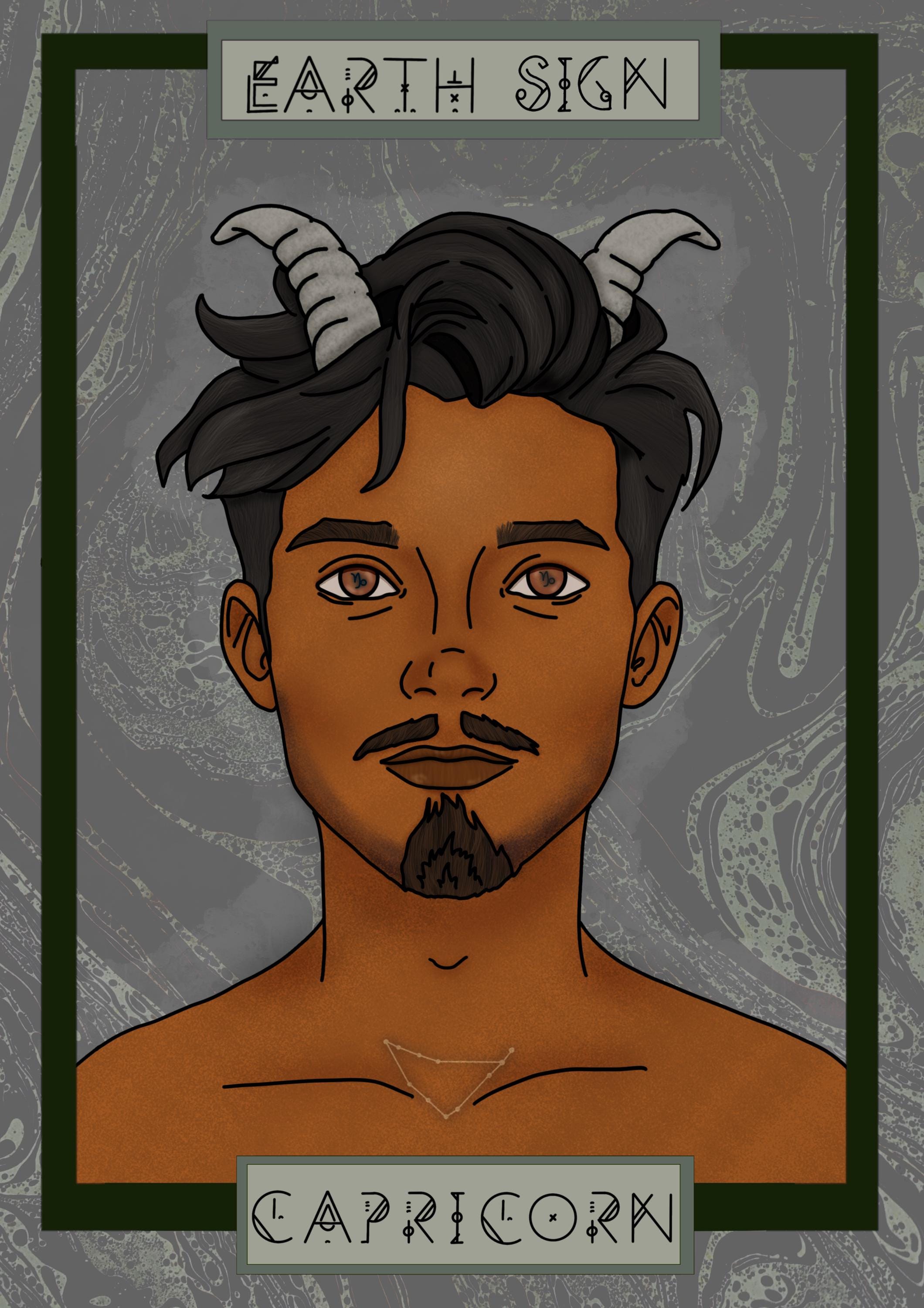 Beautiful wall decor print of original artwork. Pictured is a character design of the Capricorn Star sign inspired by several attributes of the Capricorn zodiac profile.