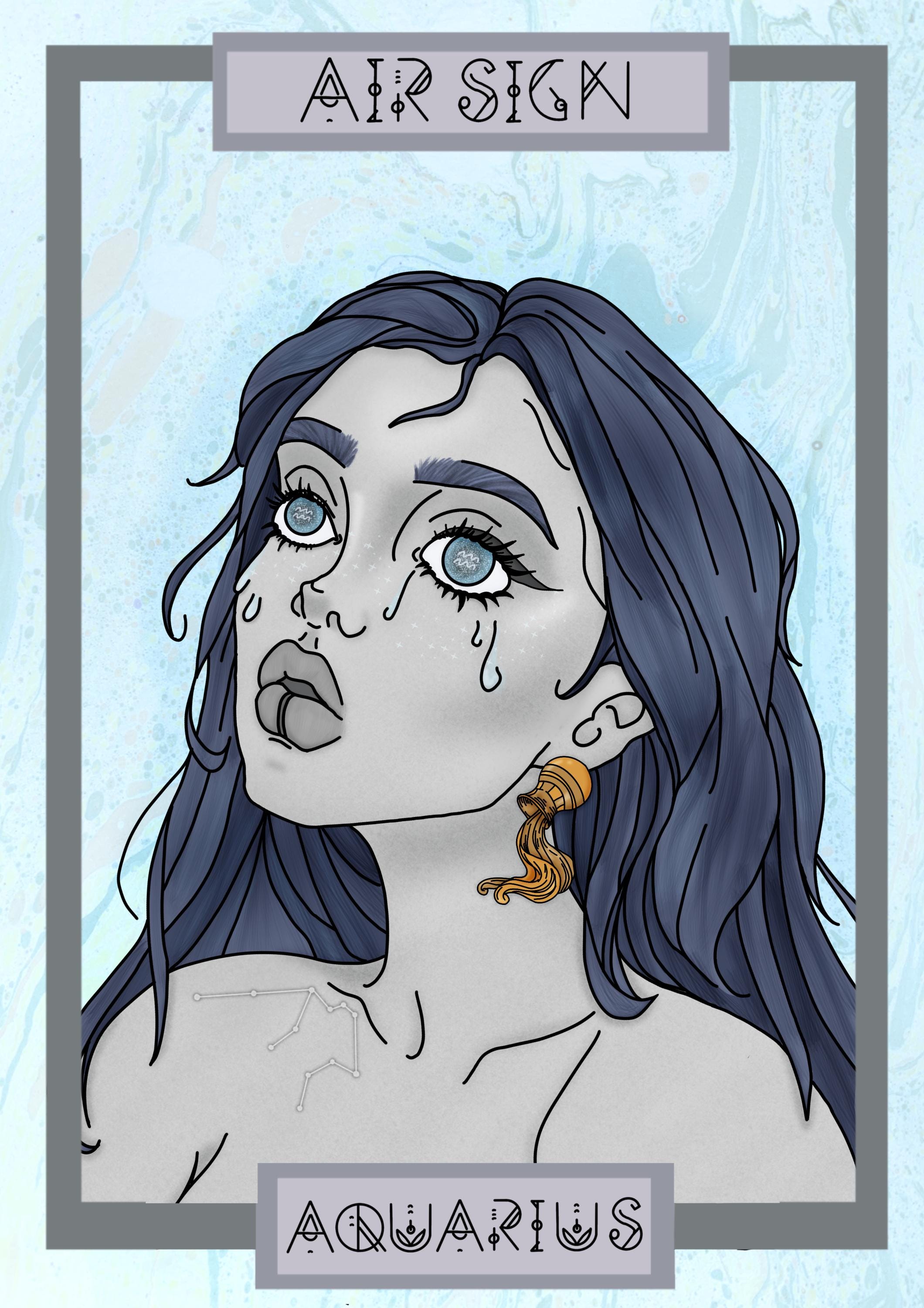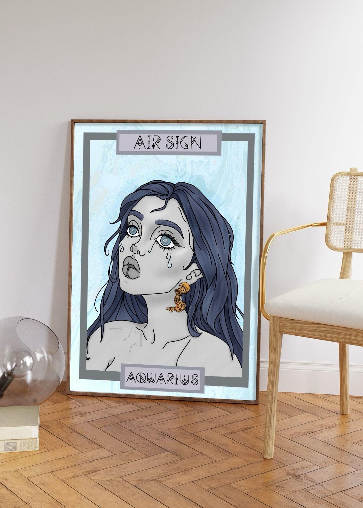 Beautiful wall decor print of original artwork. Pictured is a character design of the Aquarius Star sign inspired by several attributes of the Aquarius zodiac profile.
